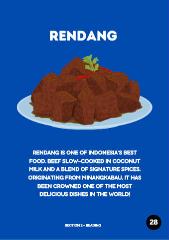 RENDANG RENDANG IS ONE OF INDONESIA’S BEST FOOD. BEEF SLOW-COOKED IN COCONUT MILK AND A BLEND OF SIGNATURE SPICES. ORIGINATING FROM MINANGKABAU, IT HAS BEEN CROWNED ONE OF THE MOST DELICIOUS DISHES IN THE WORLD! 28 SECTION 2 - READING