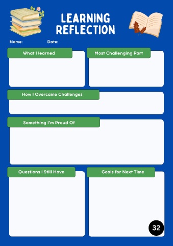 Learning Reflection Name: Date: What I learned Most Challenging Part How I Overcame Challenges Something I’m Proud Of Questions I Still Have Goals for Next Time 32
