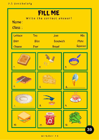 2 . 5 V o c a b u l a r y FILL ME W r i t e t h e c o r r e c t a n s w e r ! Name : Class : Lettuce Tea Jam Mix Stirr Slice Sandwich Plate Cheese Pour Bread Squeeze 1. 2. 3. 4. 5. 6. 7. 8. 9. 10. 11. 12. 39 W o r k s h e e t 2 . 3