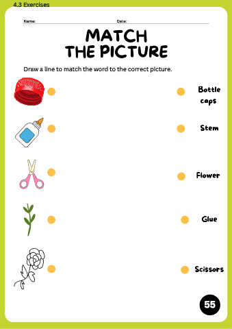 4.3 Exercises Name: Date: MATCH THE PICTURE Draw a line to match the word to the correct picture. Bottle caps Stem Flower Glue Scissors 55