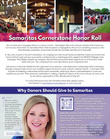 In May 2023, as part of Antioch's dissolution, the congregation voted to gift Samaritas $46,600. Samaritas received the