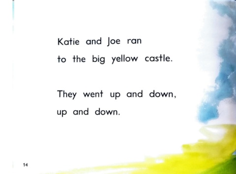 Katie and Joe ran to the big yellow castle. They went up and down, up and down. 14