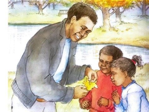 ~,,~~~~~ ~ / - . ~ "Matthew! Emma! ' t - ~\,J11, ~,. ........ p,. '- --- .\ J Come and look -' ,_:- '1''-.,. ,__ ,, ~ ' -::..r: ... at this big leaf," said Dad. "This 1s the way a leaf boat goes." l - -f"' - v' - ~ ,:-c---.~ - \ ~ -, 6 I