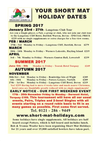Bob & Yvonne Weafer have been organising Short Mat Holidays