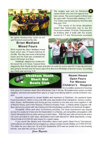 took place at Chobham Heath Short Mat Bowls Club in Surrey. 96 bowlers from seven counties