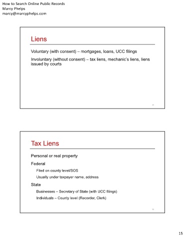 Involuntary (without consent) – tax liens, mechanic’s liens, liens