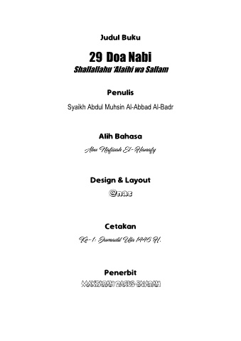 Judul Buku 29 Doa Nabi Shallallahu ‘Alaihi wa Sallam Penulis Syaikh Abdul Muhsin Al-Abbad Al-Badr Alih Bahasa Design & Layout Cetakan Penerbit ii