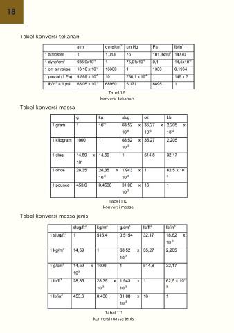 18 Tabel konversi tekanan Tabel 1.9 konversi tekanan Tabel konversi massa Tabel 1.10 konversi massa Tabel konversi massa jenis Tabel 1.11 konversi massa jenis