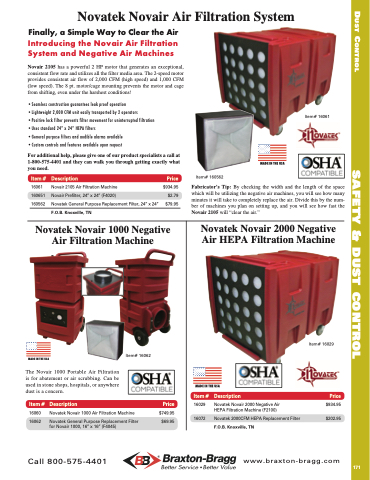 Fabricator’s Tip: By checking the width and the length of the space which will be utilizing the negative air machines, you will see how many minutes it will take to completely replace the air. Divide this by the num- ber of machines you plan on setting up, and you will see how fast the Novair 2105 will “clear the air.”