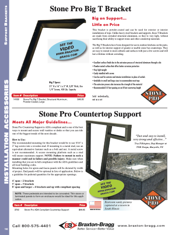 The Big T Brackets have been designed for use in outdoor kitchens on the patio, as well as for interior support of granite or marble stone bar countertops. They are easy to mount to most cabinets and surfaces with just a few screws and will last a lifetime without corroding.
