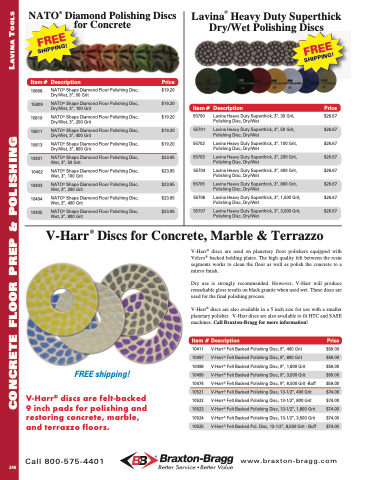 10498 V-Harr® Felt Backed Polishing Disc, 9”, 1,800 Grit 10499 V-Harr® Felt Backed Polishing Disc, 9”, 3,500 Grit 10474 V-Harr® Felt Backed Polishing Disc, 9”, 8,500 Grit -Buff 10521 V-Harr® Felt Backed Polishing Disc, 13-1/2”, 400 Grit 10522 V-Harr® Felt Backed Polishing Disc, 13-1/2”, 800 Grit 10523 V-Harr® Felt Backed Polishing Disc, 13-1/2”, 1,800 Grit 10524 V-Harr® Felt Backed Polishing Disc, 13-1/2”, 3,500 Grit 10525 V-Harr® Felt Backed Pol. Disc, 13-1/2”, 8,500 Grit - Buff