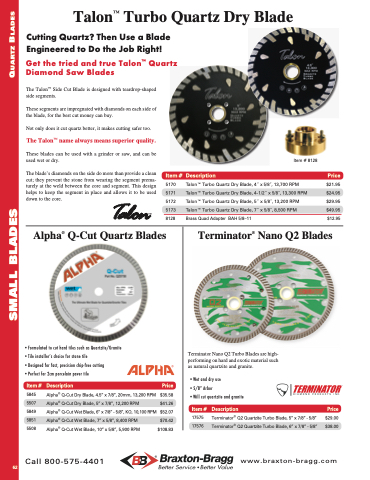 TalonTM Turbo Quartz Dry Blade, 4˝ x 5/8˝, 13,700 RPM TalonTM Turbo Quartz Dry Blade, 4-1/2˝ x 5/8˝, 13,300 RPM TalonTM Turbo Quartz Dry Blade, 5˝ x 5/8˝, 13,200 RPM TalonTM Turbo Quartz Dry Blade, 7˝ x 5/8˝, 8,500 RPM Brass Quad Adapter BAH 5/8–11