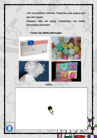 - LSD (menyebabkan halusinasi. Pengobatan pada ganguan jiwa atau sakit ingatan) - Diazepam (obat anti kejang, menimbulkan rasa kantuk, berkurangnya konsentrasi Contoh Zat adiktif psikotropika VIDEO