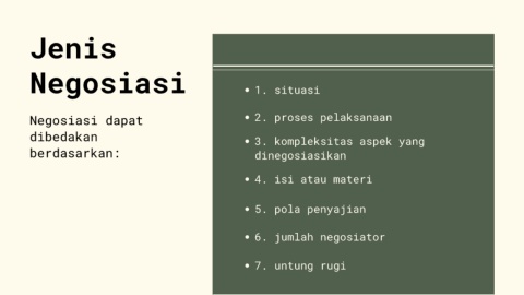Jenis Negosiasi 1. situasi Negosiasi dapat 2. proses pelaksanaan dibedakan 3. kompleksitas aspek yang berdasarkan: dinegosiasikan 4. isi atau materi 5. pola penyajian 6. jumlah negosiator 7. untung rugi