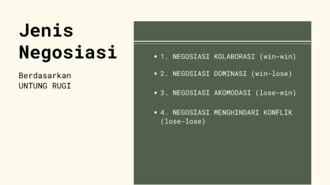 Jenis Negosiasi 1. NEGOSIASI KOLABORASI (win-win) Berdasarkan 2. NEGOSIASI DOMINASI (win-lose) UNTUNG RUGI 3. NEGOSIASI AKOMODASI (lose-win) 4. NEGOSIASI MENGHINDARI KONFLIK (lose-lose)