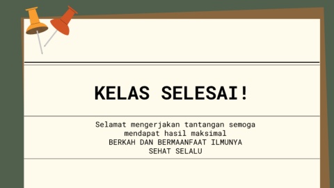 KELAS SELESAI! Selamat mengerjakan tantangan semoga mendapat hasil maksimal BERKAH DAN BERMAANFAAT ILMUNYA SEHAT SELALU