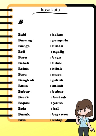 B Babi : bakas Burung : pempulu Bunga : busak Beli : ngalig Baru : bagu Bebek : bibik Belok : biluk Baca : maca Bengkok : pikuk Buka : sukab Bubur : bubur Becek : berisak Bapak : yama Bola : bal Busuk : begawou Bisa : kalap
