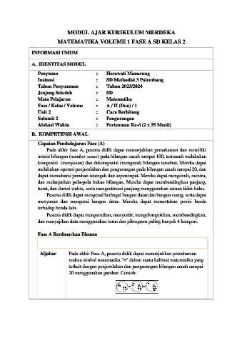 Aljabar Pada akhir Fase A, peserta didik dapat menunjukkan pemahaman