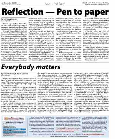 Reflection is easier said than done. The hardest time to carve out of my day or week is time for reflection, but it is a must. You see, I failed early on in my career to heed the advice from my men- tors and set aside time, no matter the duration, to reflect. I thought a sortie or mission debrief was all the reflection I needed — finding root causes or lessons learned to make the next mission better. From a technical point-of-view, that was true, and I was on my game; however, I was missing the bigger picture —the intangibles like emotional intelligence, decision making processes, and leader- ship philosophies, just to name a few. I lost valuable insight and conversations