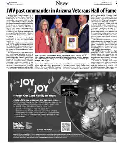 Arthur Sharf, Past Commander of Jewish War Veterans Copper State Post 619 (JWV) of Sun Lakes, was one of 15 outstanding veterans inducted into the Arizona Veterans Hall of Fame (AVHOF) by Arizona Governor Katie Hobbs and John Scott, director of Arizona Department of Veterans Services. The Oct. 24 event at Talking Stick Resort Conference Center in Scottsdale, recognizes veterans of the U.S. Military who live in Arizona and have made significant professional or volunteer contributions to their community, state, or the nation.