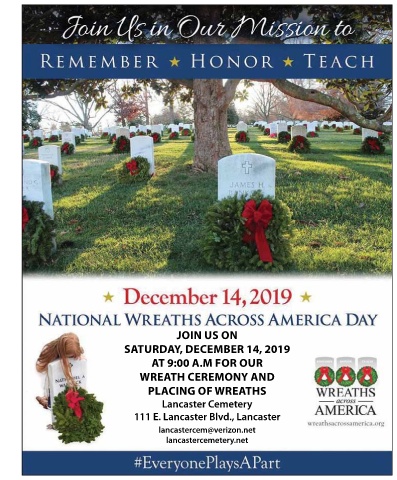 Join us on saturday, december 14, 2019 at 9:00 a.m for our wreath ceremony and placing of wreaths Lancaster Cemetery 111 E. Lancaster Blvd., Lancaster lancastercem@verizon.net lancastercemetery.net
