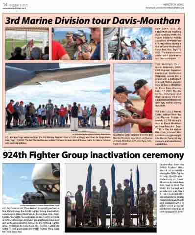TOP MIDDLE: Capt. Austin Robinson, 355th Civil Engineer Squadron Explosive Ordnance Disposal, poses for a photo with a participant of a 3rd Marine Division tour at Davis-Monthan Air Force Base, Arizona, Sept. 17, 2025. Marine Corps veterans and their spouses tried on equipment and interacted with EOD Airmen during the event.