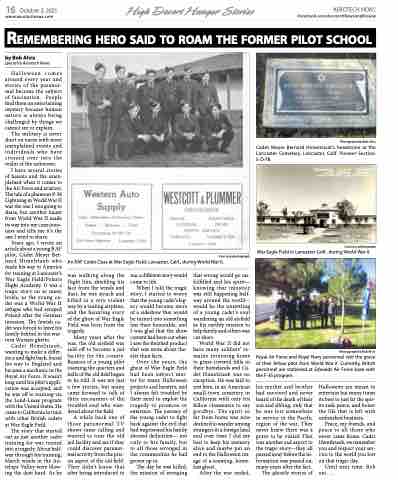 World War II did not have many soldiers’ re- mains returning home to grass-covered hills in their homelands and Ca- det Himelstaub was no exception. He was laid to rest here, in an American small-town cemetery in California with only his fellow classmates to say goodbye. The spirit so far from home was now destined to wander among strangers in a foreign land and over time I did my best to keep his memory alive and maybe put an end to the Halloween im- age of a roaming, home- less ghost.