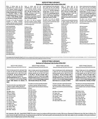 Date:September25th,2025 SignedNOVASTORAGEThisnoticeisgiveninaccordancewiththeprovisionsofsection21700etseq.ofBusiness&ProfessionalCodeoftheSateofCalifornia.The owner reserves the right to bid at the sale. All purchased goods are sold “As Is” and must be paid for and removed at the time of sale. Sales subject to prior cancellation in the event of settlement between owner & obligated party. Auctioneer: Nova Storage