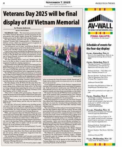 The final display of the AV Wall will take place from Nov. 8 through Nov. 11, Veterans Day observed, with the monu- ment coming down at Marie Kerr Park on Nov. 12. The field of veteran organizations supporting the series of events ask the public to mark calendars for Opening Ceremony of the final display on Nov. 8, 2025, at 4 p.m.