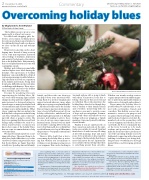 You may be wondering if you are experiencing the holiday blues. Of- ten overlooked warning signs include changes in sleep patterns, weight loss or gain, increased or decreased eating, in- creased anger or anxiety, headaches, lack of concentration and decreased interests in things you would normally do. Other classic symptoms that can indicate the holiday blues or depression include being sad often, withdrawn, and not interact- ing with others or going to events. The key is recognizing that these are all real feelings and possibilities for each of us. If you, your loved ones, or someone you know show signs of the holiday blues, here are some recommendations to help overcome them.