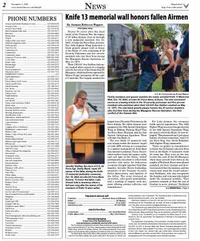 “Today we gather in remembrance to honor the 23 Airmen who lost their lives in the Knife 13 helicopter crash 50 years ago. They were on the way to save the crew of the SS Mayaguez when their aircraft went down in the jungles of Thailand. Every man aboard perished, yet their courage and devo- tion ensured that the mission, and the values they stood for, would endure,” said Berkland, who also recognized the families and veterans who helped make the memorial possible. “Your presence reminds us that the cost of freedom is never abstract,” Berkland