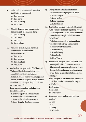B. Latar waktu dan latar tempat 16. Kata yang menunjukan kata hubung