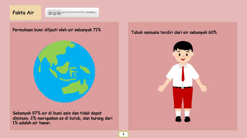 Permukaan bumi diliputi oleh air sebanyak 71%                        Tubuh manusia terdiri dari air sebanyak 60%