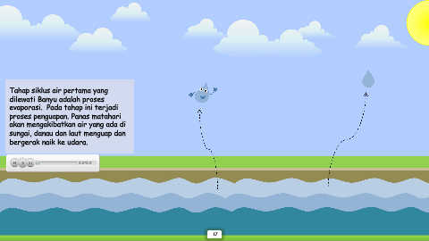 Tahap siklus air pertama yang dilewati Banyu adalah proses evaporasi. Pada tahap ini terjadi proses penguapan. Panas matahari akan mengakibatkan air yang ada di sungai, danau dan laut menguap dan bergerak naik ke udara. 17
