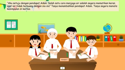 “Aku setuju dengan pendapat Adam. Salah satu cara menjaga air adalah segera mematikan keran agar air tidak terbuang dengan sia-sia” Tasya menambahkan pendapat Adam. Tasya segera menulis kesimpulan di kertas. Kelompok 1 35