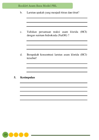 Booklet Asam Basa Model PBL b. Larutan apakah yang menjadi titran dan titrat? c. Tuliskan persamaan reaksi asam klorida (HCl) dengan natrium hidroksida (NaOH) ? d. Berapakah konsentrasi larutan asam klorida (HCl) tersebut! 5. Kesimpulan 51