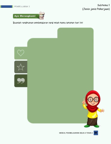 Subtema 1 (Jenis-jenis Pekerjaan) Ayo Merangkum! Buatlah rangkuman pembelajaran yang telah kamu lakukan hari ini! MODUL PEMBELAJARAN KELAS 4 TEMA 4 25