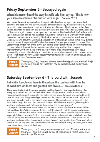 Joseph’s circumstances were bleak, but he wasn’t alone. God was with him. We’re not told how God’s kindness manifested itself for Joseph, but it’s reassuring to know that it did. I believe that when times are hard God is at work, manifesting his kindness in people’s lives. I know he’s often done so in mine. In times of trial and challenge, I’ve tried to discipline myself to notice what I call God’s ‘grace notes’ – those signs of his kindness and grace that I could easily miss if I wasn’t paying attention. They remind me that I’m not on my own, but that God is with me and at work in my situation, no matter how bleak it may seem at the time.