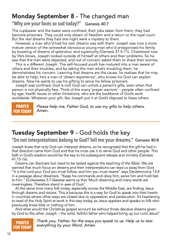 Joseph was confined; God is not! God can unlock a person’s gifts, even when that person is not physically free. Think of the many ‘prayer warriors’ – people often confined by age, health issues or other limitations, who are the backbone of God’s work worldwide. Whatever your gift, like Joseph put it at God’s disposal to bless others.