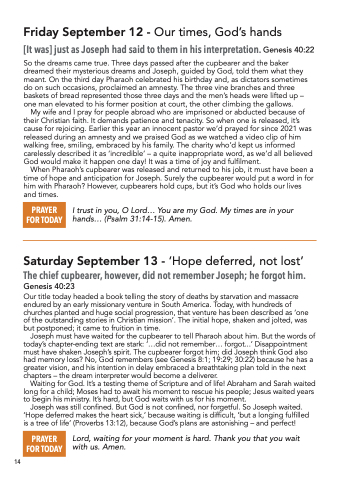 Joseph must have waited for the cupbearer to tell Pharaoh about him. But the words of today’s chapter-ending text are stark: ‘...did not remember... forgot...’ Disappointment must have shaken Joseph’s spirit. The cupbearer forgot him; did Joseph think God also had memory loss? No, God remembers (see Genesis 8:1; 19:29; 30:22) because he has a greater vision, and his intention in delay embraced a breathtaking plan told in the next chapters – the dream interpreter would become a deliverer.