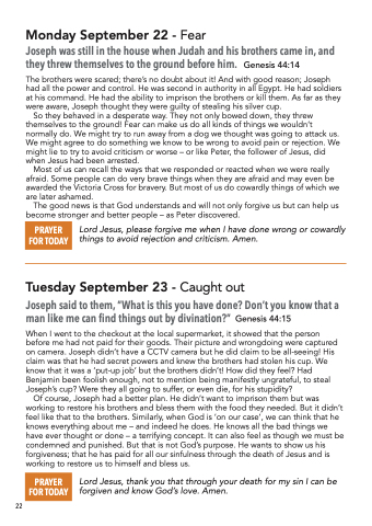 Of course, Joseph had a better plan. He didn’t want to imprison them but was working to restore his brothers and bless them with the food they needed. But it didn’t feel like that to the brothers. Similarly, when God is ‘on our case’, we can think that he knows everything about me – and indeed he does. He knows all the bad things we have ever thought or done – a terrifying concept. It can also feel as though we must be condemned and punished. But that is not God’s purpose. He wants to show us his forgiveness; that he has paid for all our sinfulness through the death of Jesus and is working to restore us to himself and bless us.