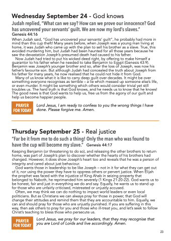 God wants those in leadership to be like Joseph – not in it for what they can get out of it, nor using the power they have to oppress others or pervert justice. When Elijah the prophet was faced with the injustice of King Ahab in seizing property that belonged to Naboth, he reprimanded him severely (1 Kings 21:20-22). God wants us to be honest, fair and just in everything we do and say. Equally, he wants us to stand up for those who are unfairly criticised, mistreated or unjustly accused.