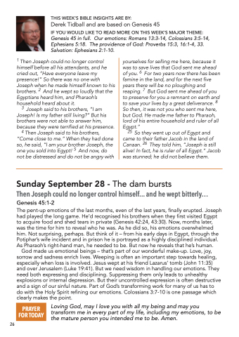 Genesis 45 in full. Our emotions: Romans 13:3-14, Colossians 3:5-14, Ephesians 5:18. The providence of God: Proverbs 15:3, 16:1-4, 33. Salvation: Ephesians 2:1-10.