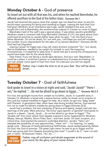 Jacob had a problem; the twin pressures of famine and seeing Joseph vied with the warnings of the past. Were previous, ‘No Entry’ signs specific or general? God spoke to Jacob in a dream: “Jacob, Jacob... do not be afraid to go down to Egypt.” The ‘double call’ from God, where God repeats a person’s name, happened for Abraham, Moses, Samuel, Martha, Simon Peter, Saul – and here Jacob. On each occasion, at a critical time, God wanted the person’s undivided attention. Jacob’s “Here I am” released the possibility of new opportunities. “Here I am” – I’m listening, I’m ready, speak Lord... Because of God’s generational faithfulness, Jacob waited patiently before his God, the God of promise. The green light came; he was to go to Egypt and his God was going with him! Despite everything that cried “I couldn’t do it”, here I sit with pen in hand – all because I heard, “Ian, Ian...”