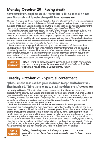 Perhaps the lesson for us is that we don’t need terminal illness to get on with conferring our blessings to the next generation. Whether healthy or sick, we can be a Jacob and make a spiritual deposit into the next generation(s). Jesus, even as he hung on the cross, spoke blessing to his mother and disciple, John, connecting them as family. You may have young children, or grown children and grandchildren, or you may just see the youth running around at your church. You have something spiritual to confer upon them from your years on this Christian path. Pray for them, speak to them, give them gifts (natural and spiritual), offer wisdom, ask how they are, give to Christian youth charities, volunteer in your youth department, buy a batch of youth Bibles and hand them out. You are not finished yet. Pass on the blessing you have!