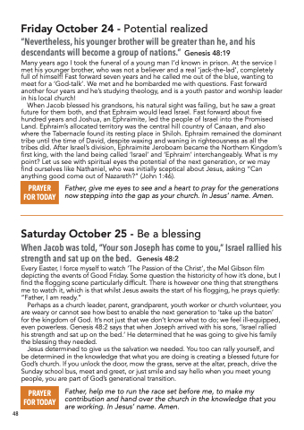 Perhaps as a church leader, parent, grandparent, youth worker or church volunteer, you are weary or cannot see how best to enable the next generation to ‘take up the baton’ for the kingdom of God. It’s not just that we don’t know what to do; we feel ill-equipped, even powerless. Genesis 48:2 says that when Joseph arrived with his sons, ‘Israel rallied his strength and sat up on the bed.’ He determined that he was going to give his family the blessing they needed.