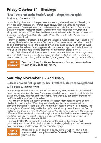 In concluding his words to Joseph, Jacob’s speech gushes with words of blessing on every aspect of Joseph’s life – from heaven above, from the earth, on his future generations... Blessings indeed, and rich rewards for his faithfulness to God and his trust in the God of his father Jacob. I wonder how his brothers felt now, standing alongside this ‘prince’? Their lives had been examined too by Jacob, their actions and decisions found wanting. But not Joseph. Whose life would I rather ‘learn’ from? Joseph’s, every time!