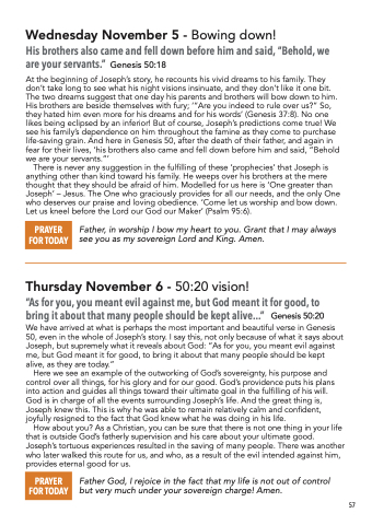 Here we see an example of the outworking of God’s sovereignty, his purpose and control over all things, for his glory and for our good. God’s providence puts his plans into action and guides all things toward their ultimate goal in the fulfilling of his will. God is in charge of all the events surrounding Joseph’s life. And the great thing is, Joseph knew this. This is why he was able to remain relatively calm and confident, joyfully resigned to the fact that God knew what he was doing in his life.