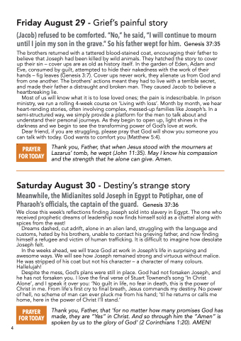 Most of us will know what it is to lose loved ones; the pain is indescribable. In prison ministry, we run a rolling 4-week course on ‘Living with loss’. Month by month, we hear heart-rending stories, often involving complex, messed-up families like Joseph’s. In a semi-structured way, we simply provide a platform for the men to talk about and understand their personal journeys. As they begin to open up, light shines in the darkness and we begin to see the transforming power of God’s love at work.