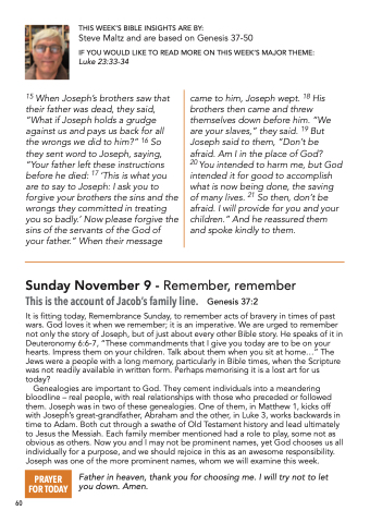 It is fitting today, Remembrance Sunday, to remember acts of bravery in times of past wars. God loves it when we remember; it is an imperative. We are urged to remember not only the story of Joseph, but of just about every other Bible story. He speaks of it in Deuteronomy 6:6-7, “These commandments that I give you today are to be on your hearts. Impress them on your children. Talk about them when you sit at home...” The Jews were a people with a long memory, particularly in Bible times, when the Scripture was not readily available in written form. Perhaps memorising it is a lost art for us today?